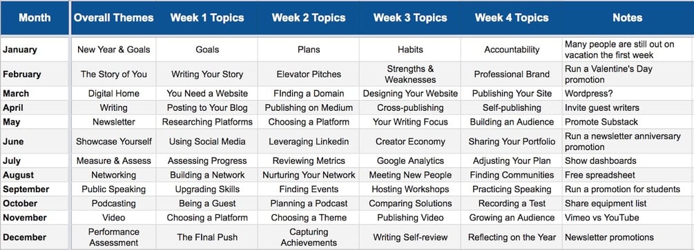This is a simple content calendar template for: